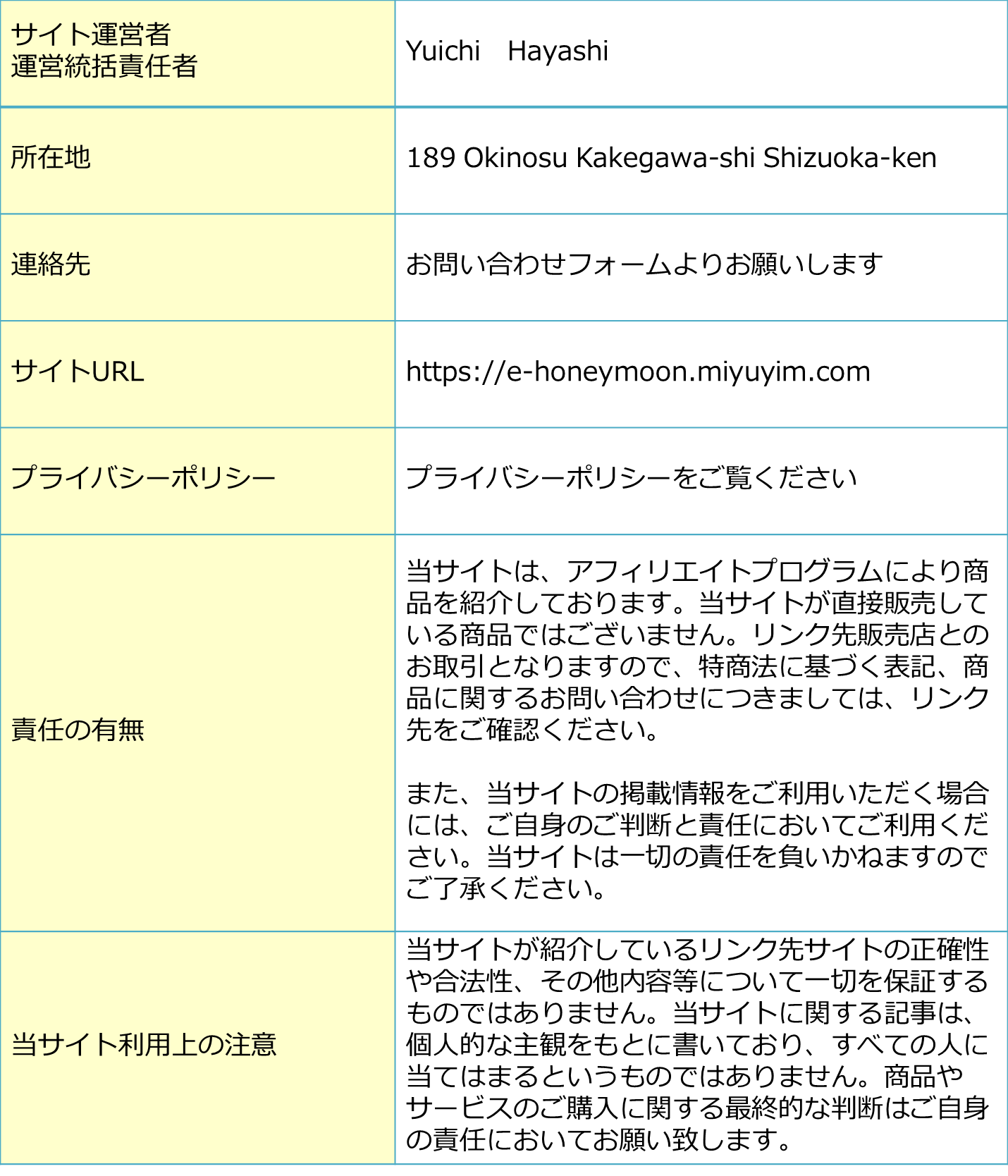 特定電子メール法に基づく表記 お問い合わせフォーム → https://e-honeymoon.miyuyim.com/inquiry/ プライバシーポリシー → https://e-honeymoon.miyuyim.com/privacy-policy/